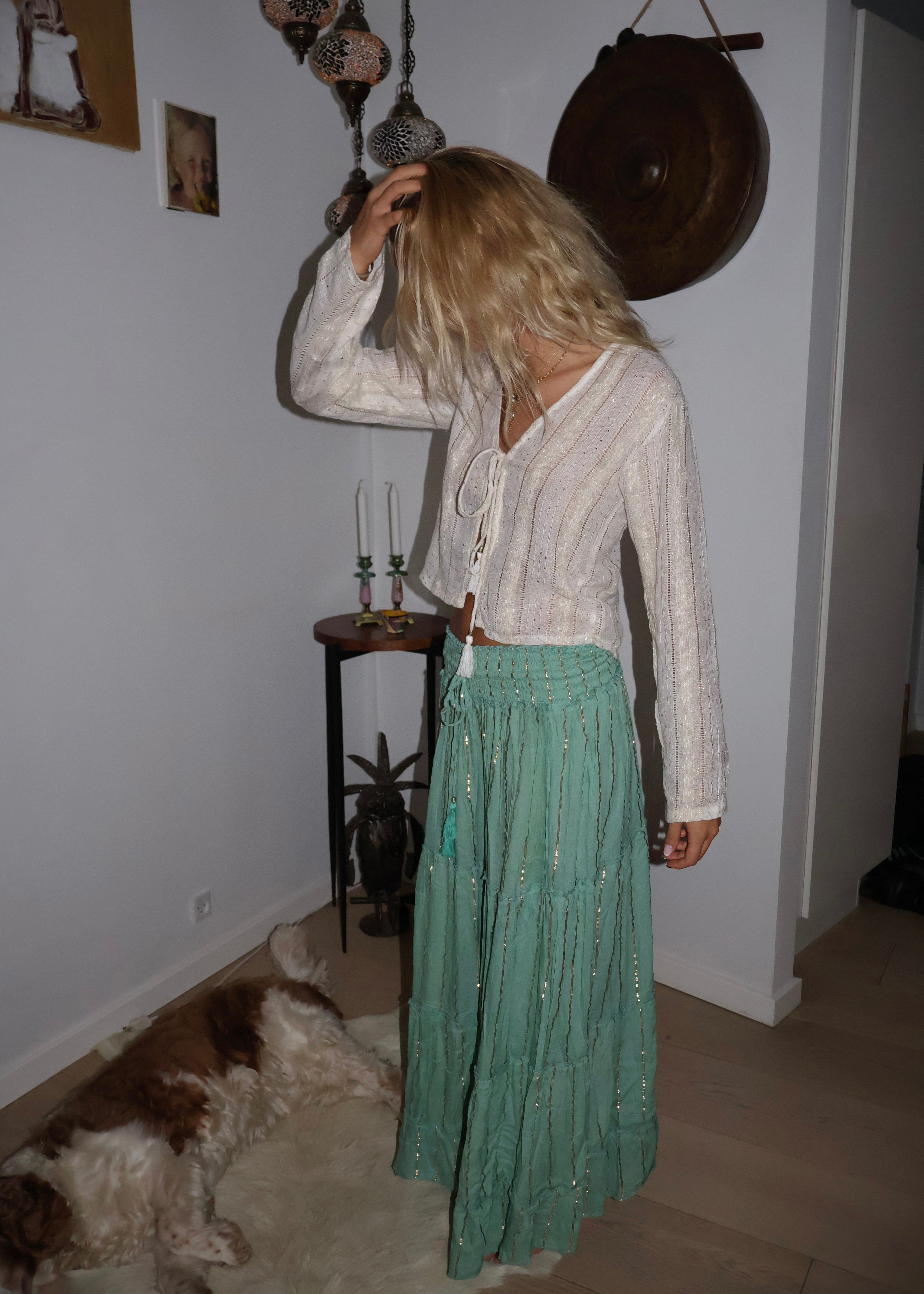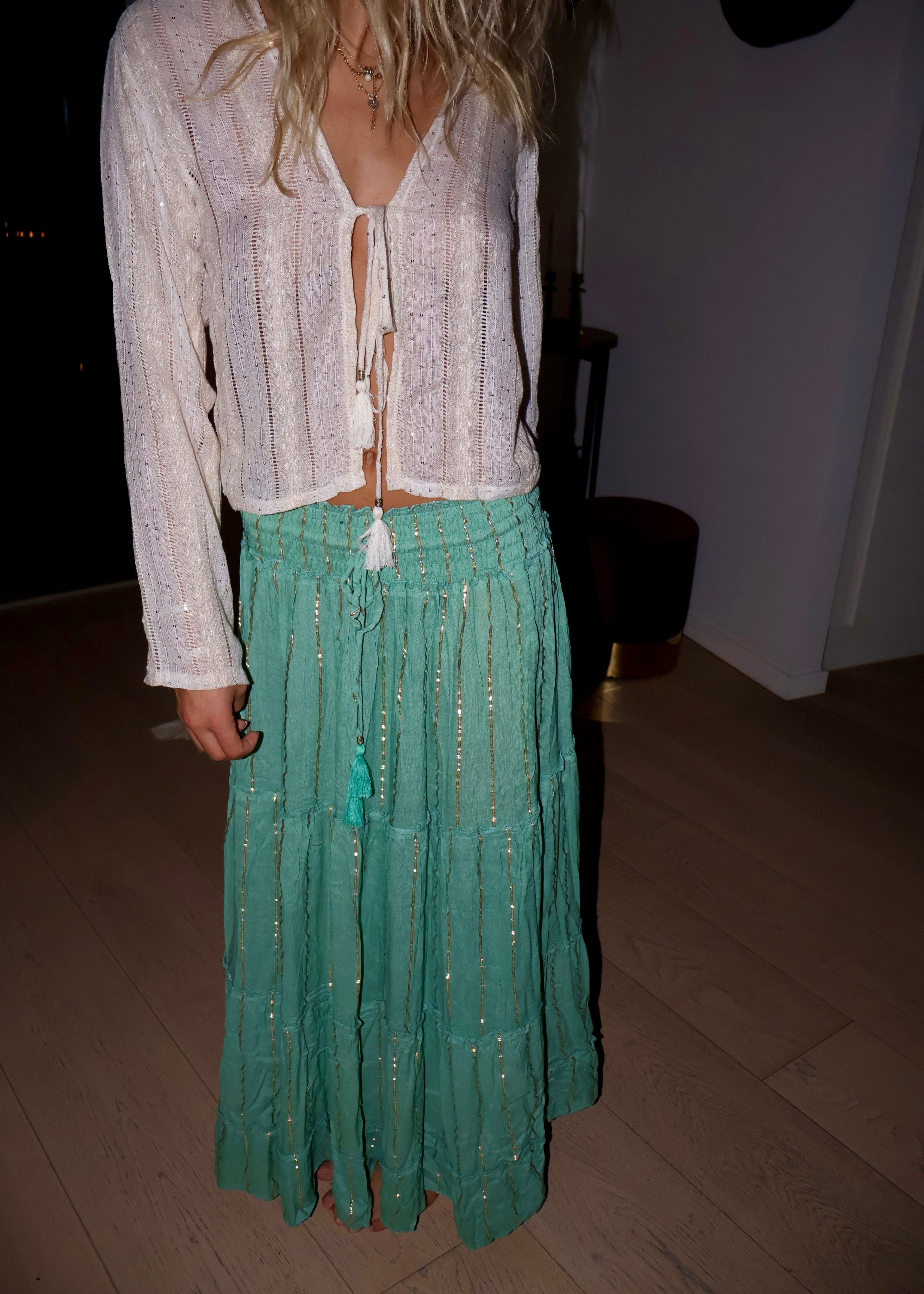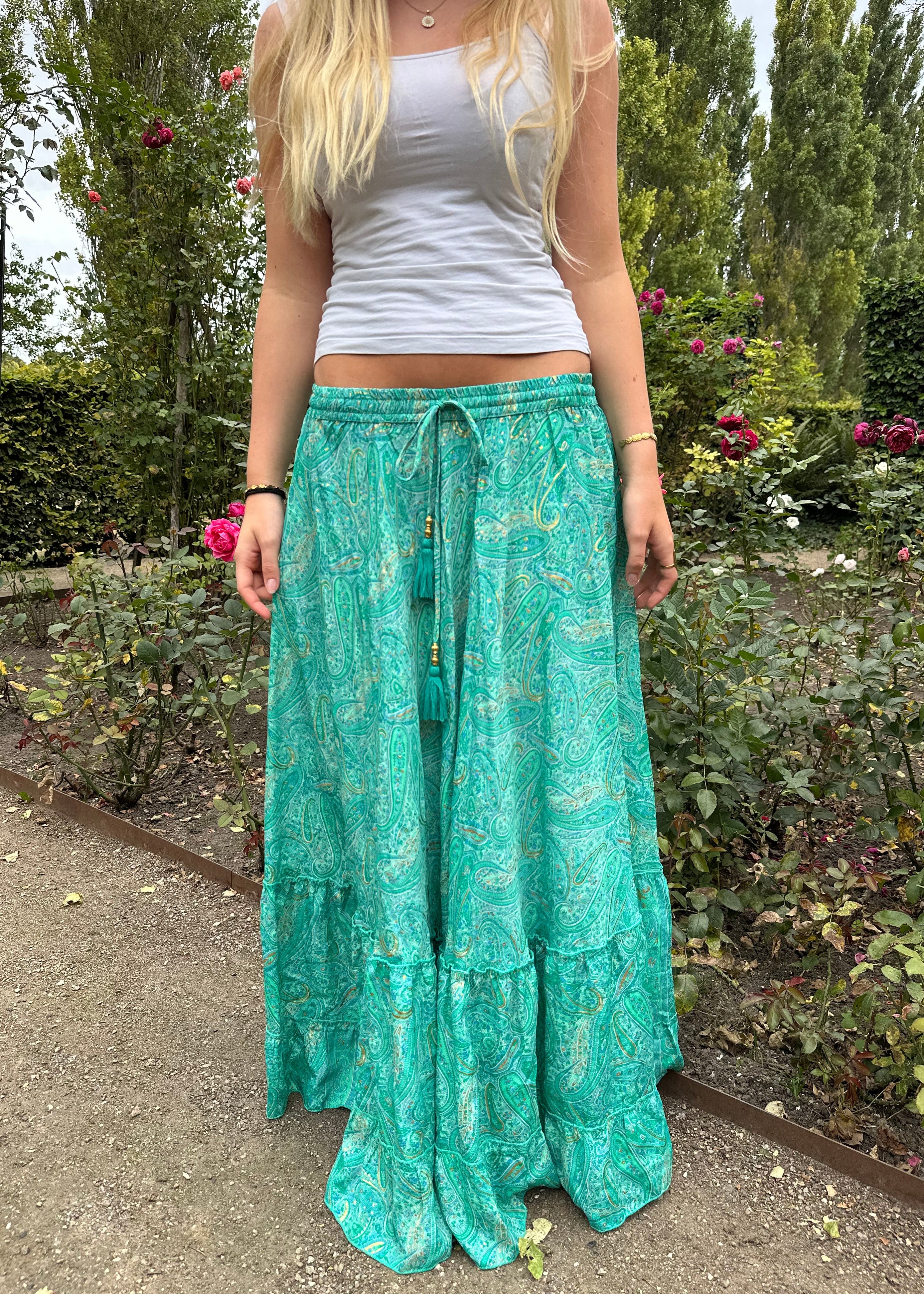 Turquoise Green Maxi Skirt with Gold Foil