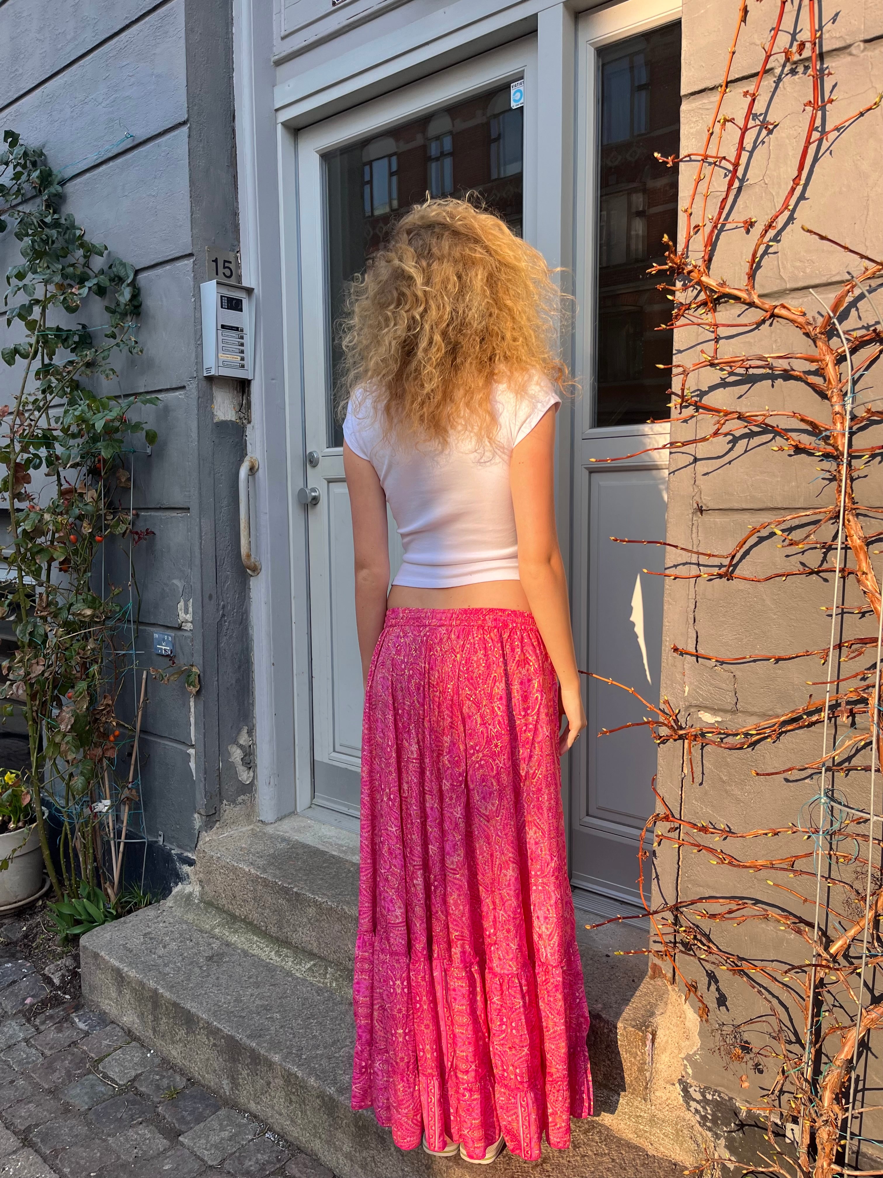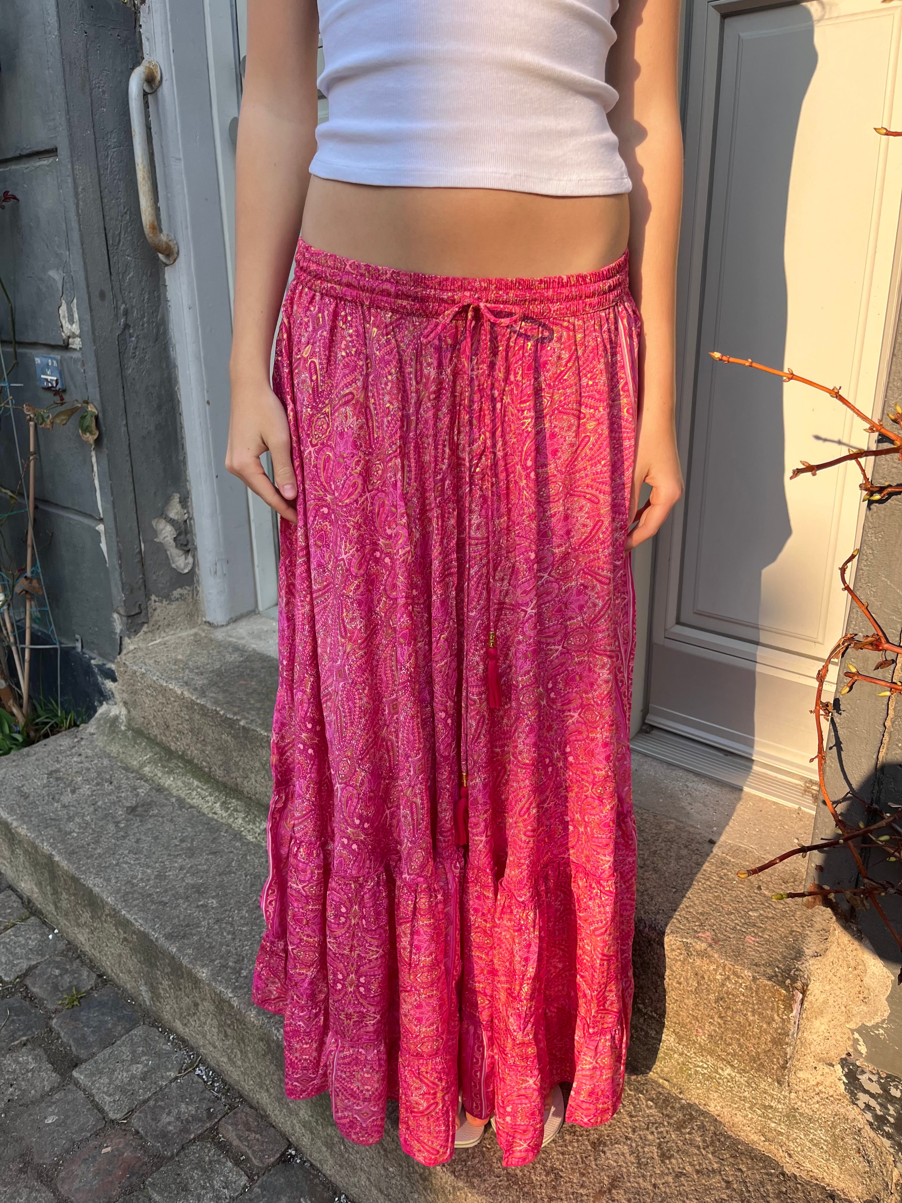 Mørkelyserød Maxinederdel med guldfolie