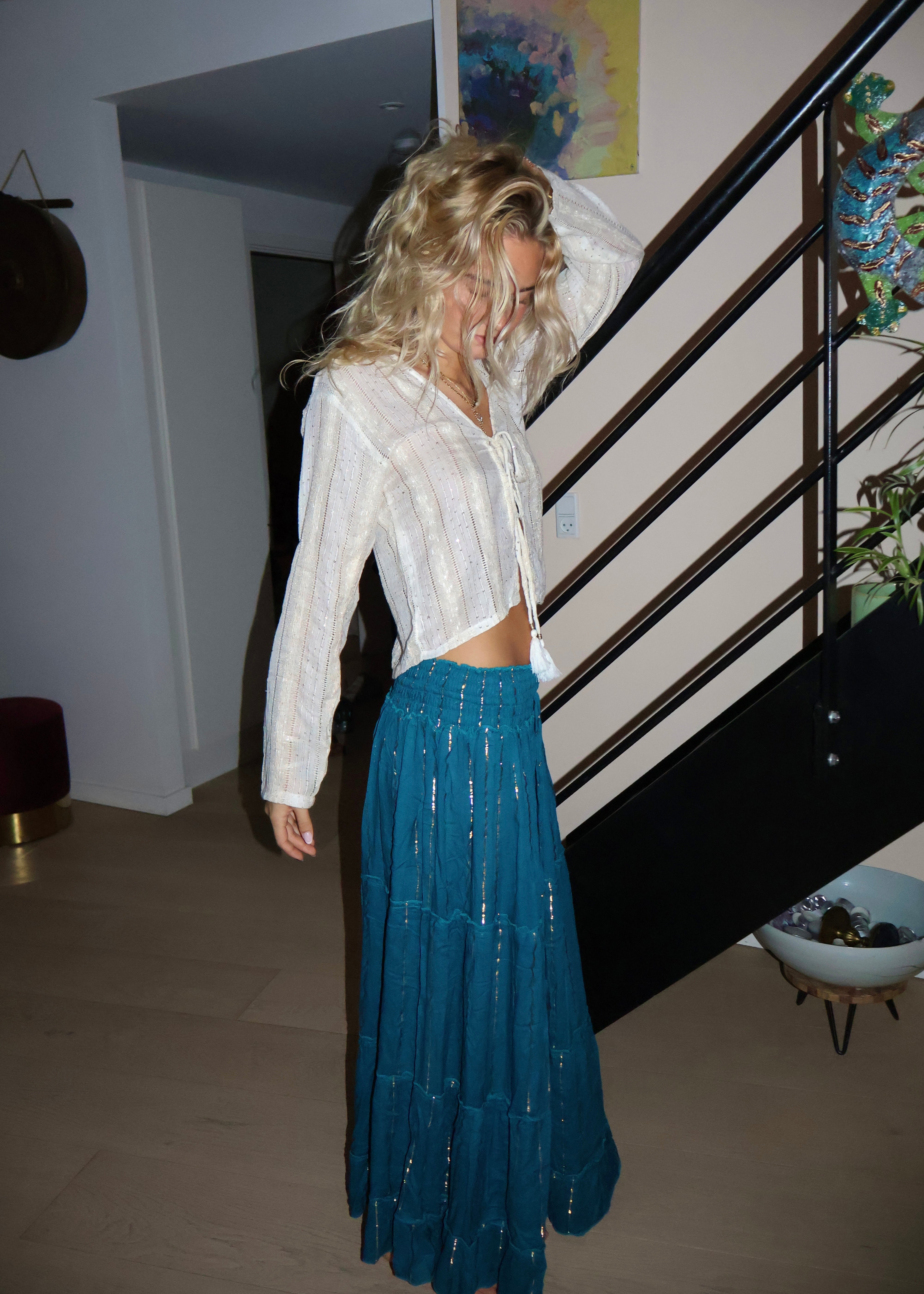 Turquoise Maxi Skirt with Gold Foil